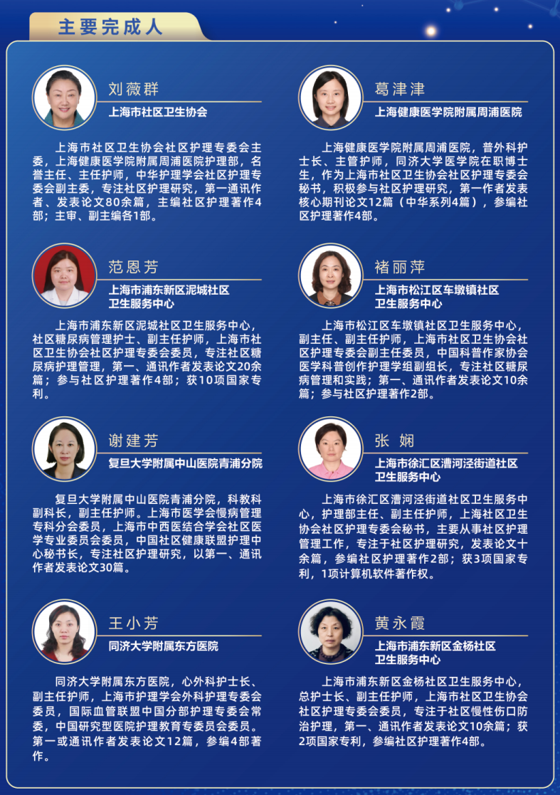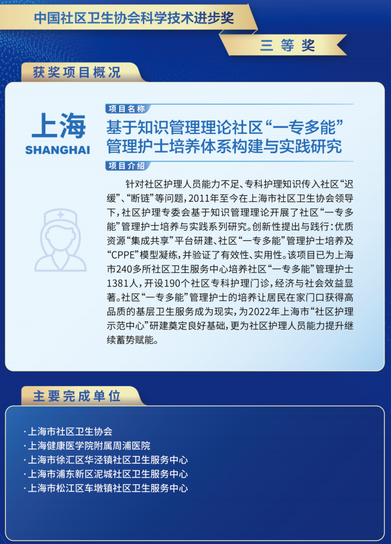 项目在上海市240多所社区卫生服务中心培养“一专多能”管理护士1381人(包括糖尿病、伤口护理、PICC维护、安宁疗护),开设190个相应社区专科护理门诊,有效提升护士职业自信。同质化、便捷的服务受到居民称赞。培养同济大学护理科研型硕士研究生5名。发表论文39篇,主编著作3部,形成规范:①社区“一专多能”管理护士工作职责与考核标准。②社区PICC维护视频全市社区卫生服务中心内部发行。③上海市社区护理质量管理标准(预研制)第二部分《社区特色护理》。